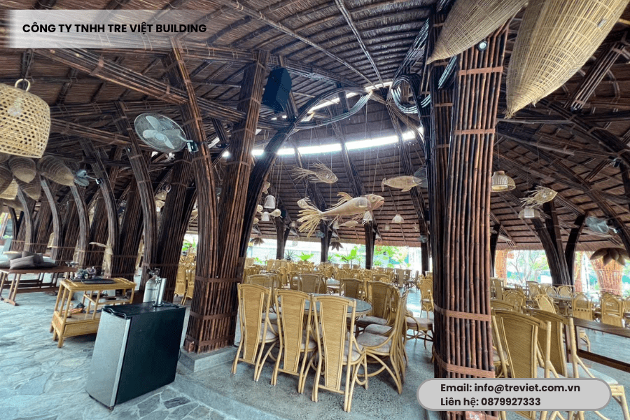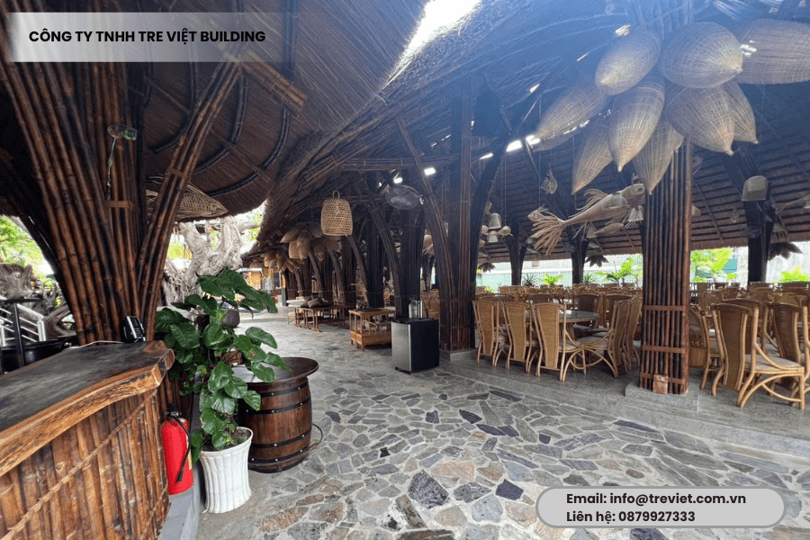 Tiến hành thi công các hạng mục như vách, cửa, sàn và các chi tiết nội – ngoại thất bằng tre, nứa hoặc vật liệu tự nhiên khác. Tùy vào yêu cầu của từng công trình mà đội ngũ có thể tích hợp thêm hệ thống chiếu sáng, mành tre, mái phụ hoặc các tiện ích liên quan.