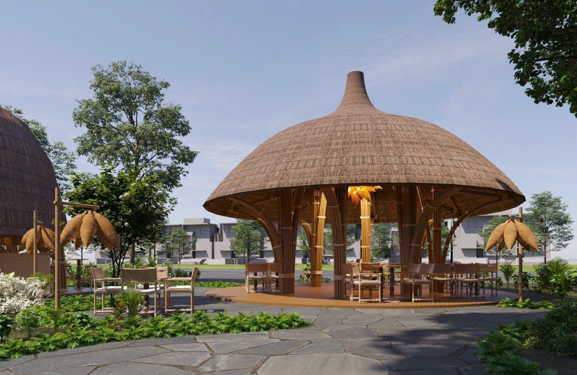 Mặt bằng công trình được đội ngũ thi công định vị chính xác theo bản vẽ. Sau đó tiến hành đào móng và chôn cột tre với độ sâu từ 50 – 70cm, đảm bảo cố định bằng bê tông để kết cấu được vững chắc.